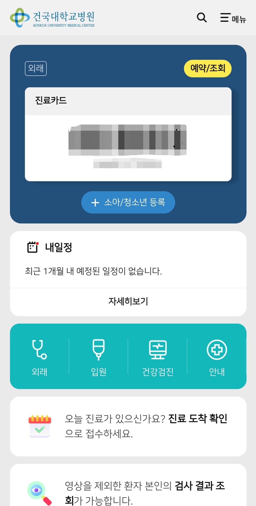 환자 바코드 스티커를 잃어버리더라도 건국대학교병원 어플을 통해 내 바코드와 진료 예약 일정 등을 확인할 수 있다.