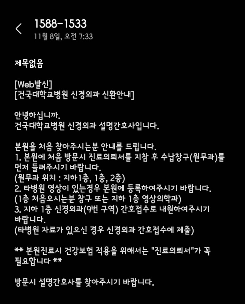 여기까지가 처음 건국대학교병원 방문했을 때 과정인데 이후로는 순서대로 해당과에 가서 간호접수대에서 한번 접수하고 설명간호사 만나서 안내 듣고 진료 듣고 다음 일정 잡고 검사 일정이 담긴 안내 종이 받으면 끝!!