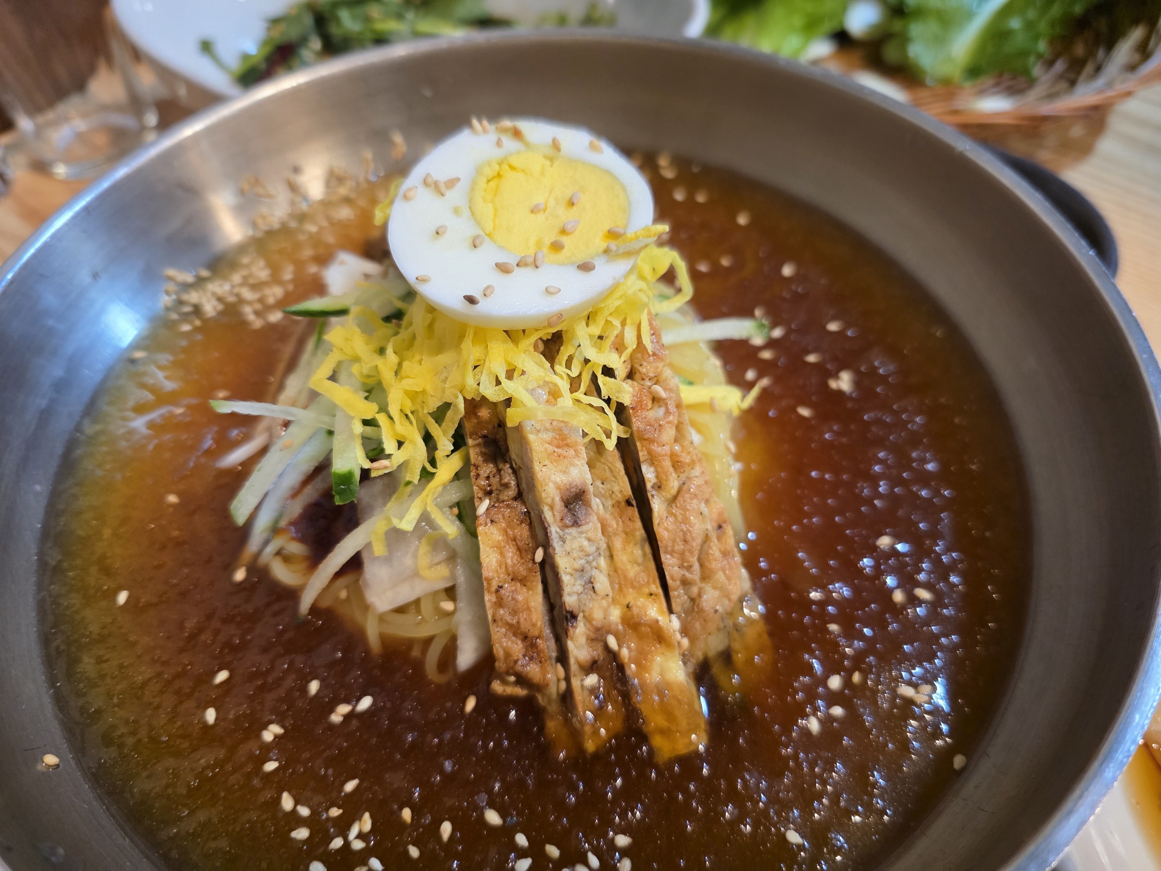 저는 개인적으로 물밀면보다는 비빔밀면이 더 맛있더라구요. 밀면 위에 육전이 올라가서 이색적이에요.
