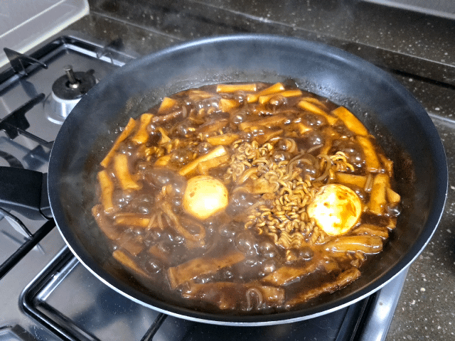 짜장 베이스 양념소스, 밀떡, 쫄면, 라면사리, 떡사리, 어묵, 단무지 넣어주시고