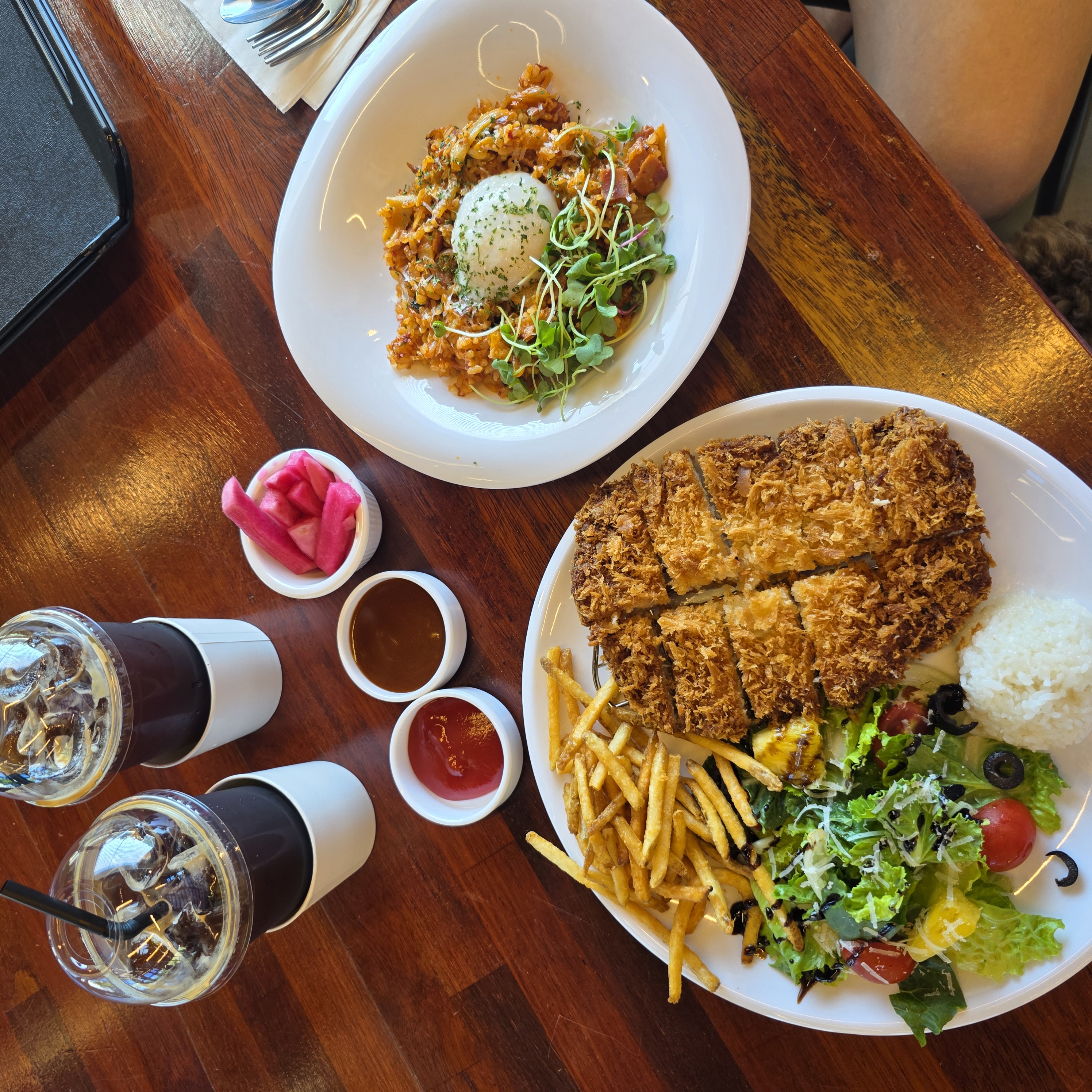 우리도 식사를 못 해서 카페에서 돈까스, 김치필라프를 먹었는데