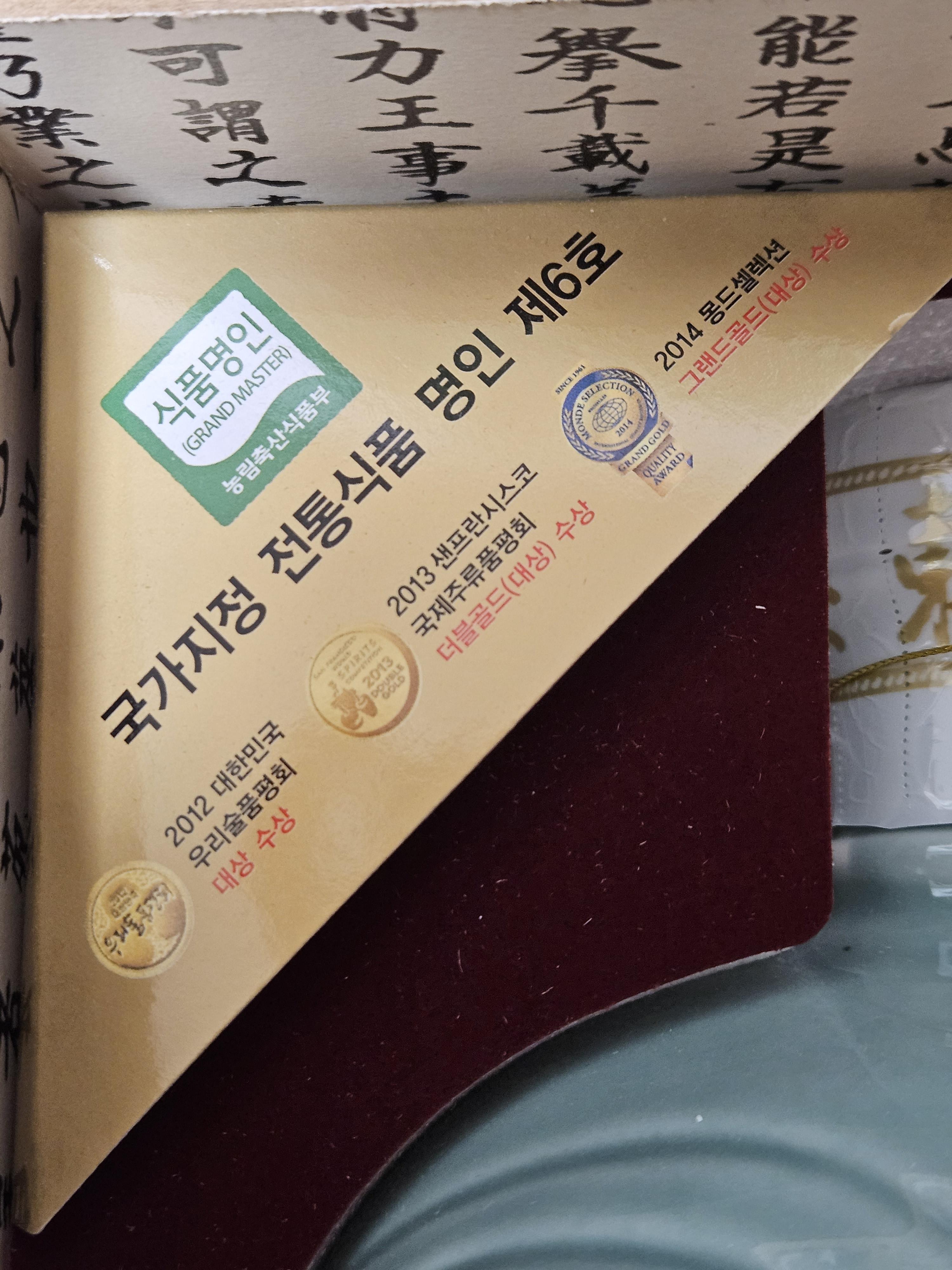 이 안동소주는 국가에서 지정한 전통식품 명인이 만든 술이며, 다양한 수상내역이 있다.