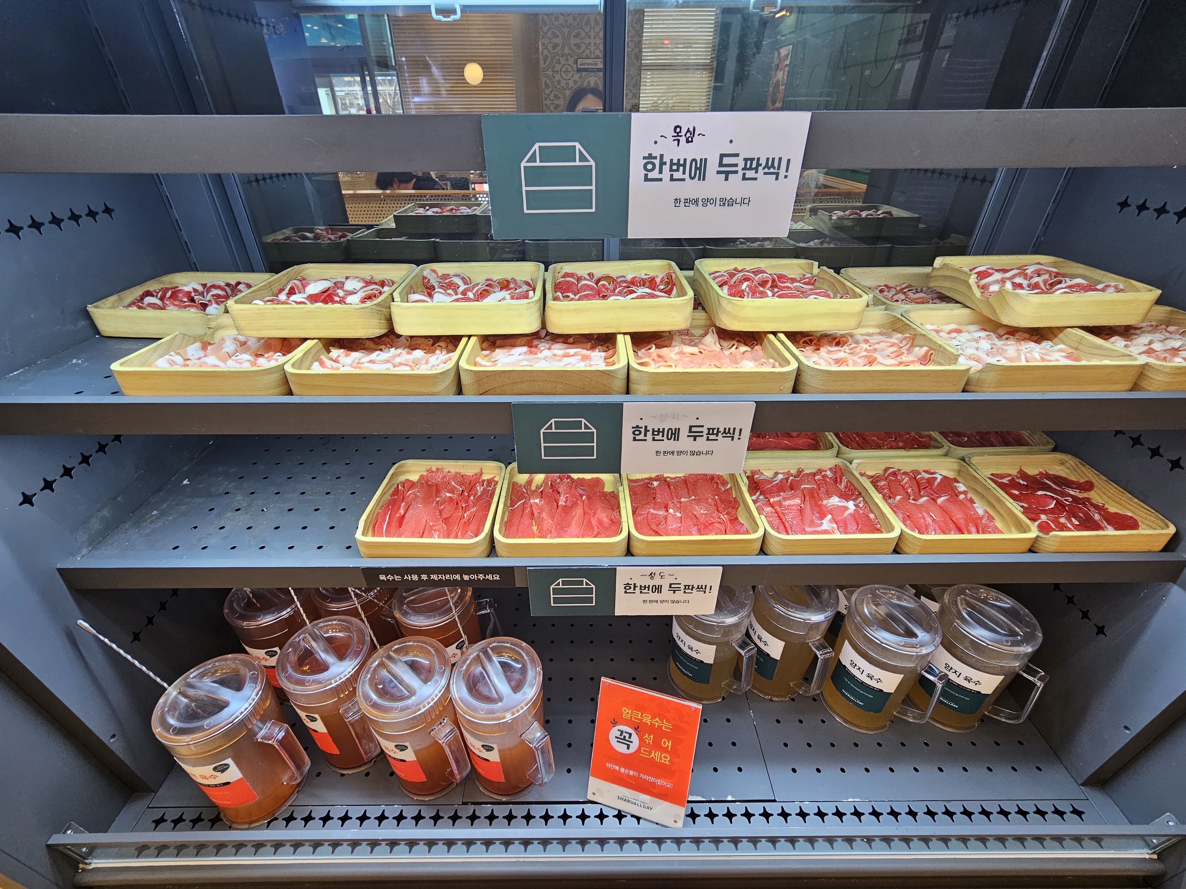 처음에 자리 세팅할 때 고기를 가져다준다. 그 외 추가로 고기 먹을 땐 한 번에 가져올 때 두 판씩 가져오면 된다