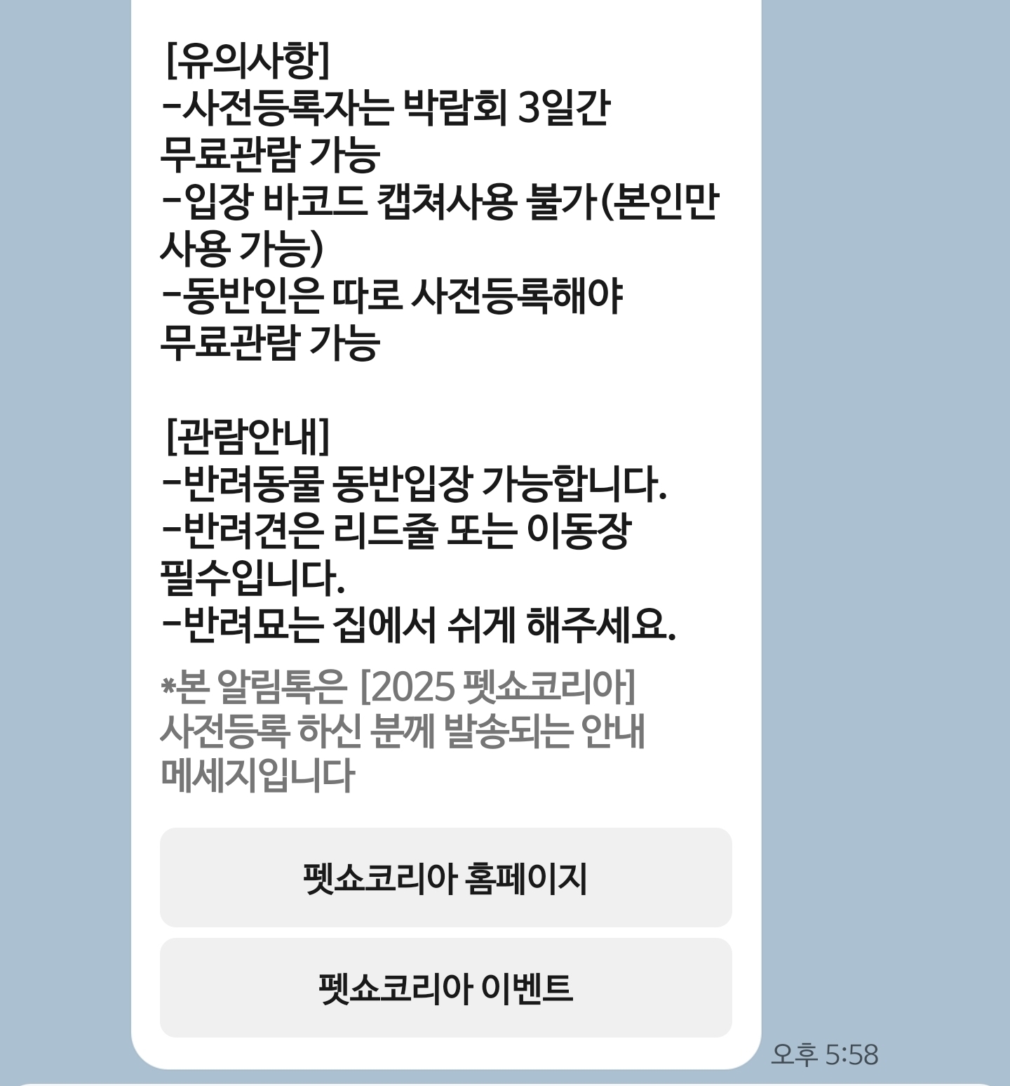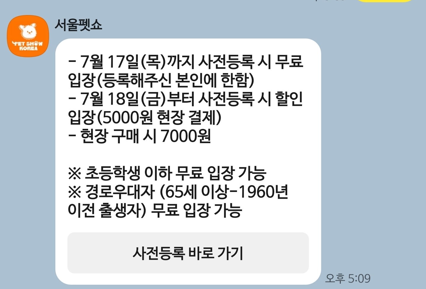 사전등록은 펫쇼코리아 박람회 일정 전날 7/17(목)까지 등록해야 하며