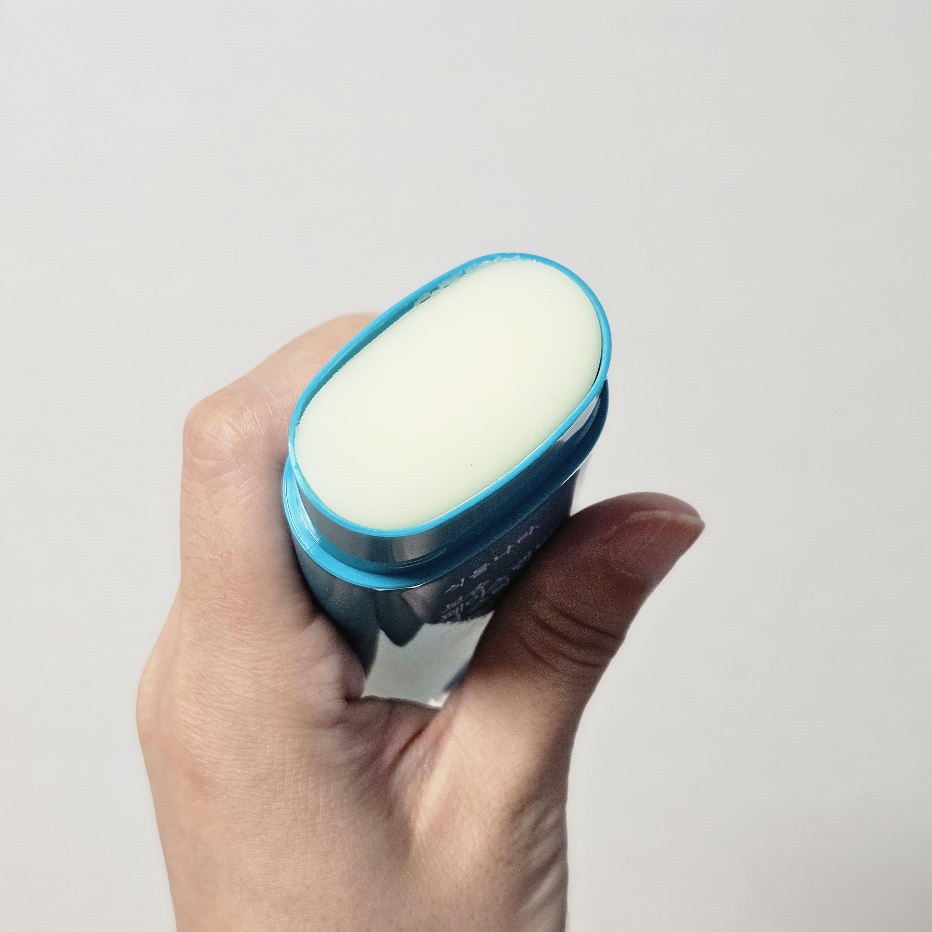 안에 선스틱 내용물이 투명한 하얀색이에요. 백탁이 없을 뿐만 아니라 향도 없어서 혹시나 향에 예민한 분들도 거림낌 없이 사용할 수 있는 제품입니다.
