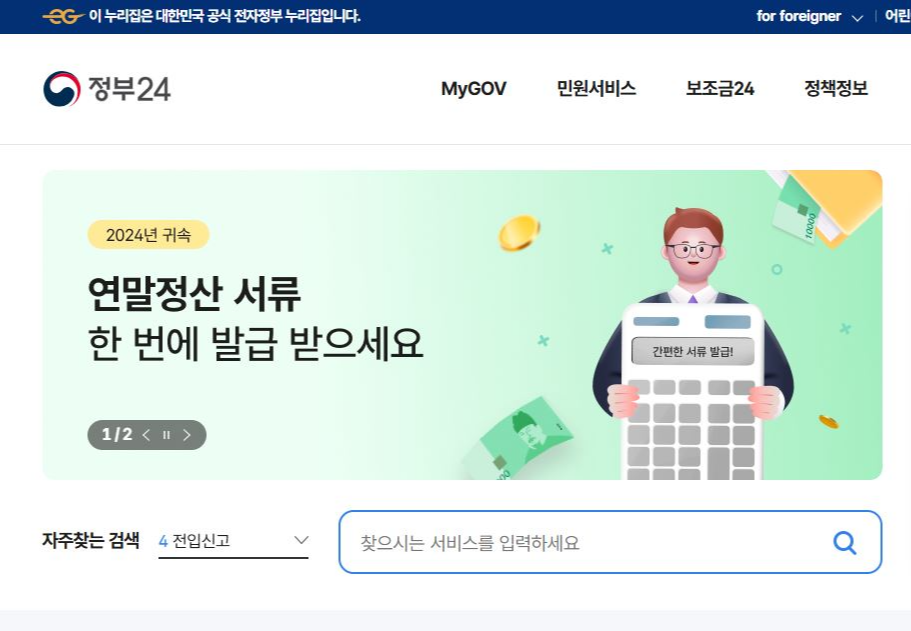 정부24사이트에 들어가며 메인화면에 연말정산 서류 한 번에 발급 받으세요라는 문구가 보인다