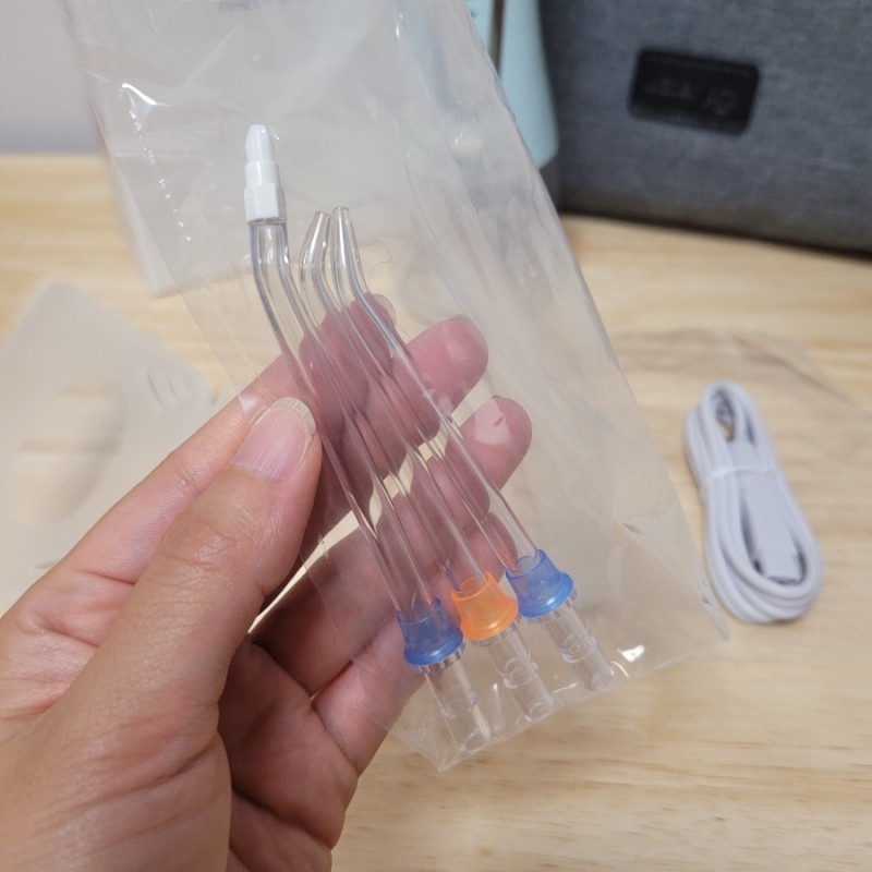 기본 노즐 2개와 치아교정용 노즐 1개가 있는데 치아교정용은 끝부분이 작은 칫솔모가 있어서 교정기 음식물 제거에 도움이 됩니다. 한손에 잡히는 가벼운 사이즈이고 노즐 끼우는 부분도 360도 돌아가기 때문에 잡기 편한 각도에 따라 돌려서 사용할 수 있습니다.