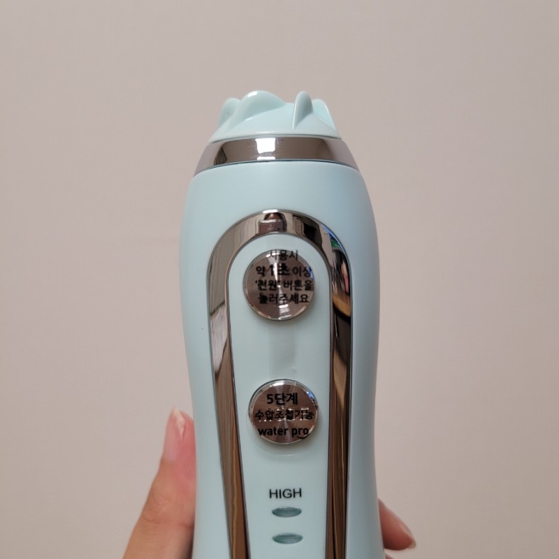 수압조절을 먼저 한 다음에 전원버튼을 누르도록 합니다. 잇몸약한 사람이 수압이 센 상태였는데 조절 안 하고 바로 전원 누를 경우 엄청 센 물줄기로 인해 잇몸에 피가 날 수 있습니다.