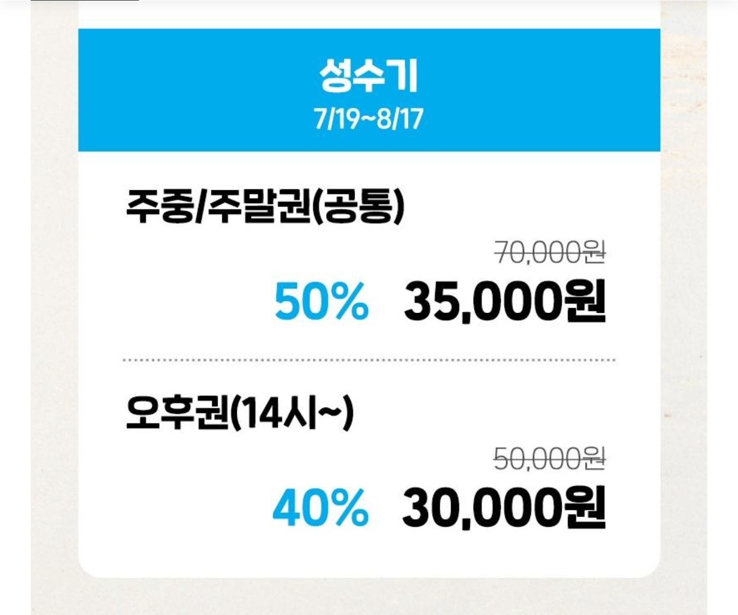 성수기 - 주중,주말 35,000원 / 오후 2시 입장 30,000원