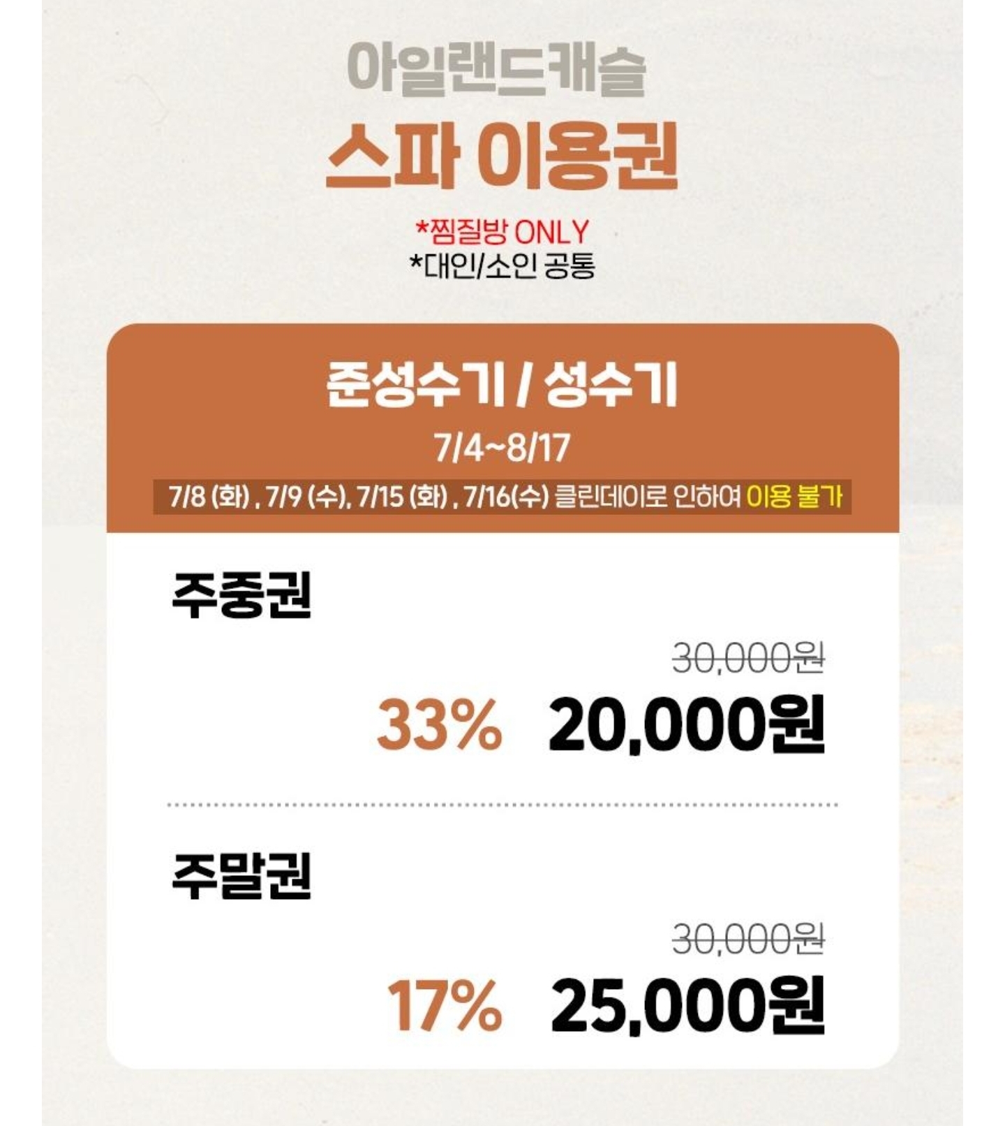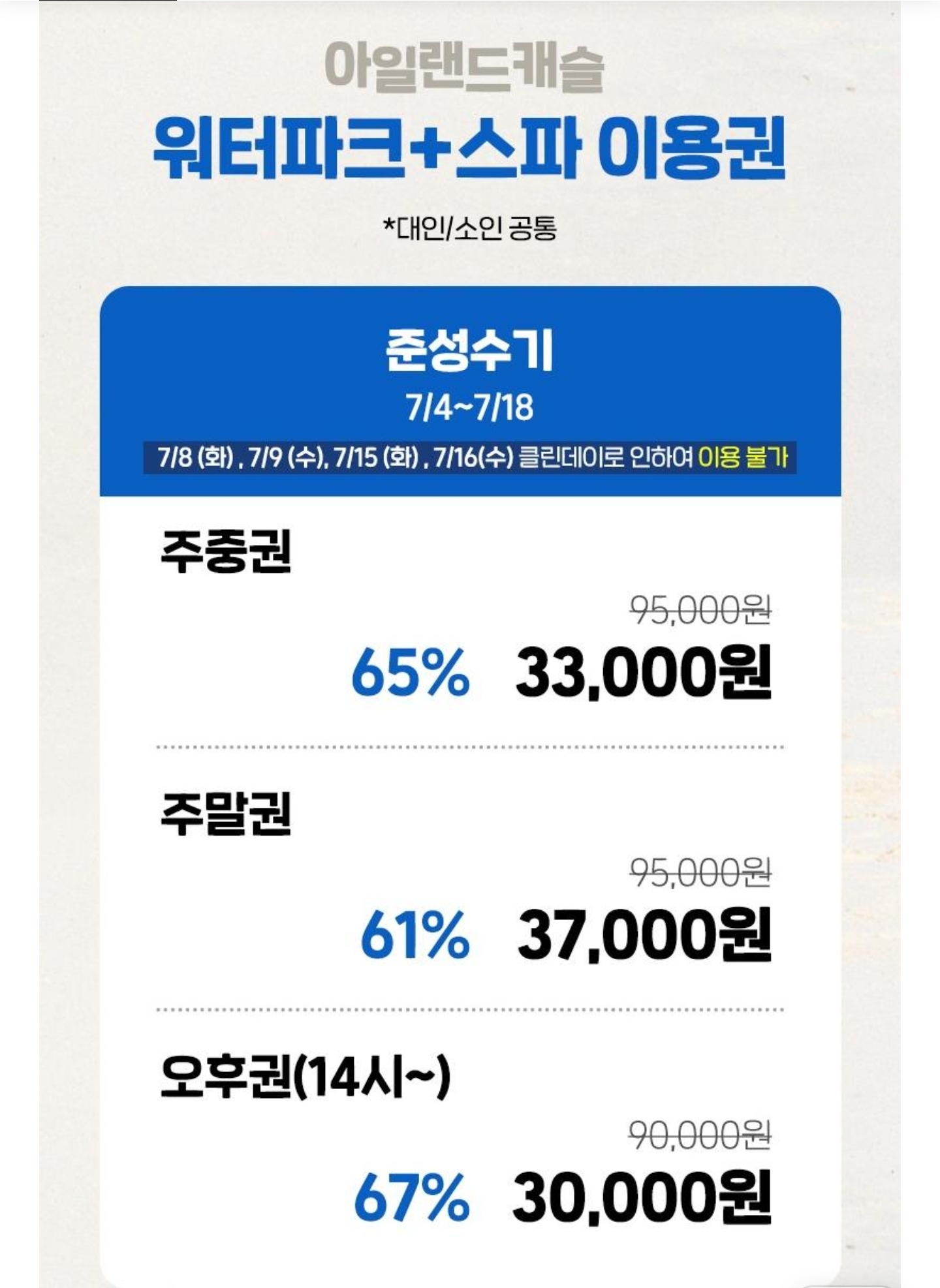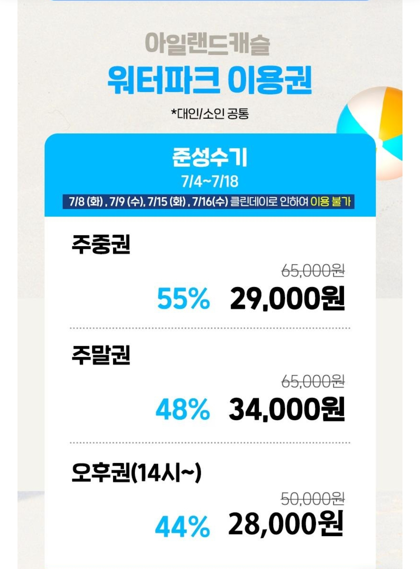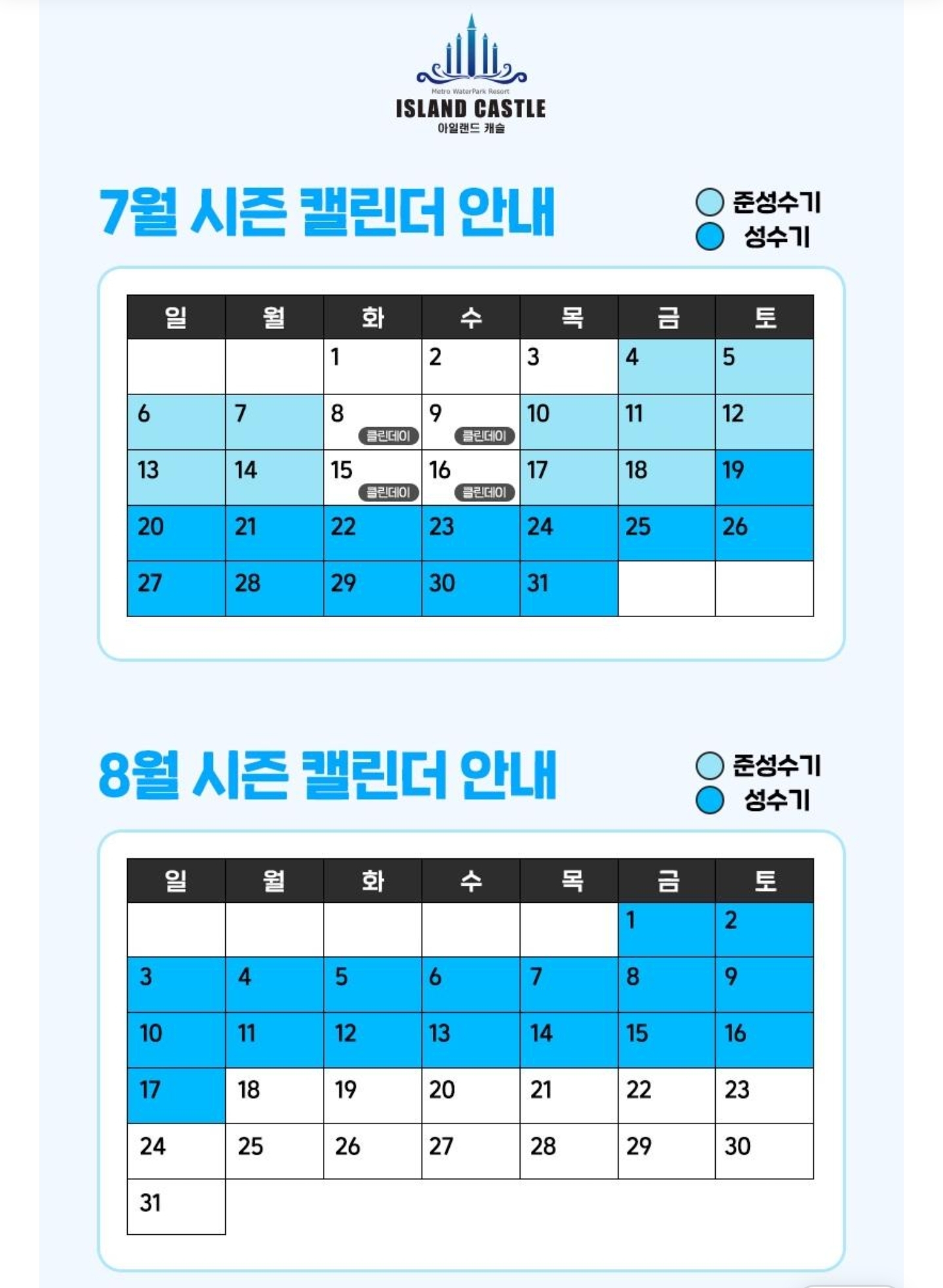 아일랜드캐슬 워터파크 입장권은 준성수기, 성수기에 따라 금액이 달라집니다