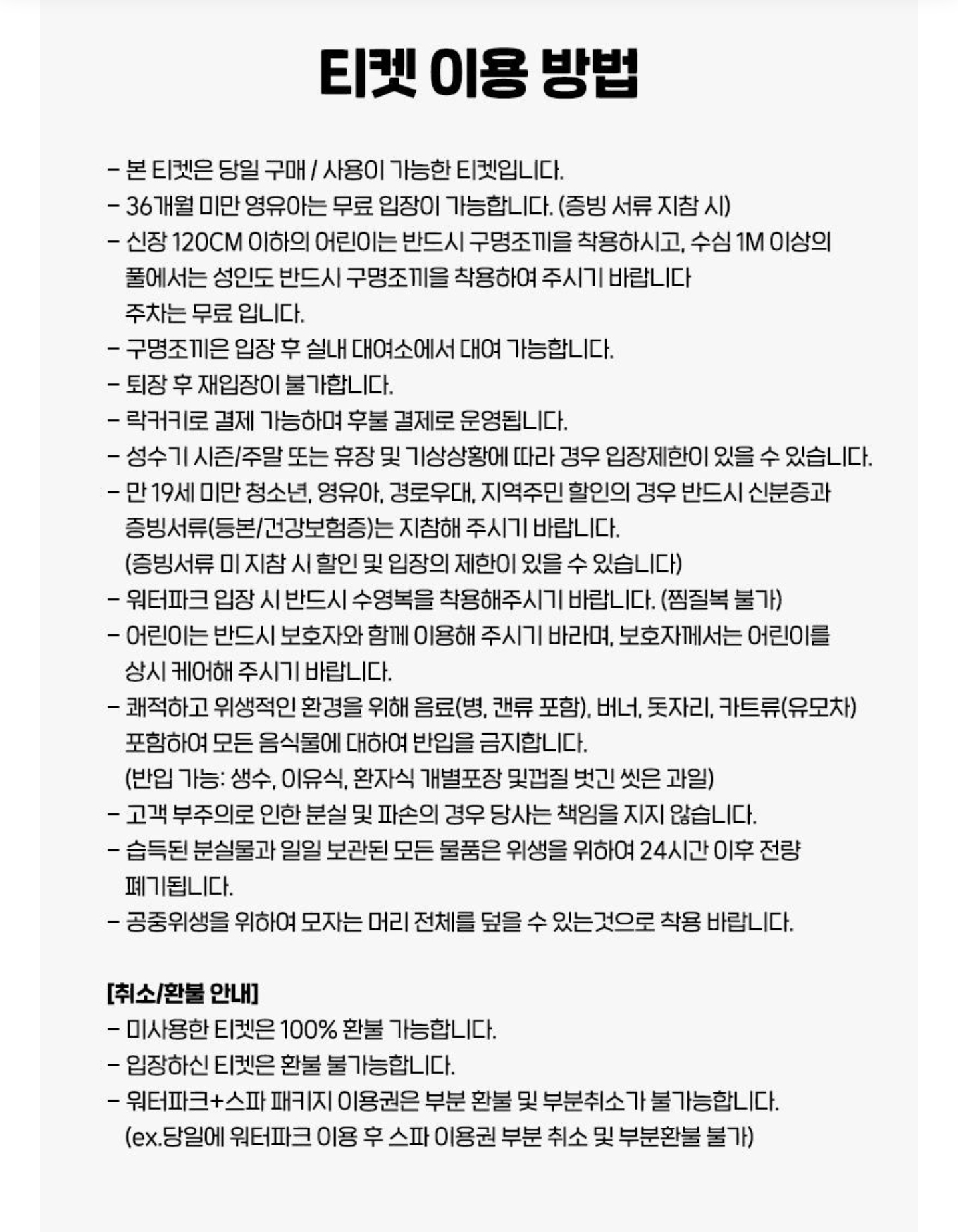 * 워터파크+스파 패키지 이용권은 부분 환불 및 부분 취소 불가