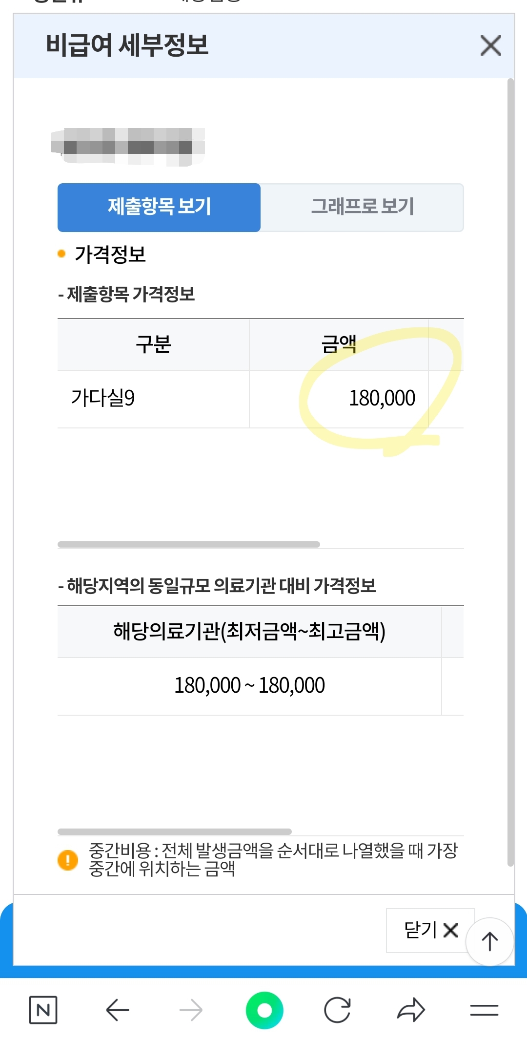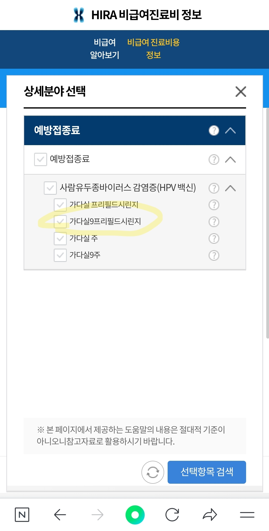 건강보험심사평가원 사이트 접속 - 상단에 비급여진료비용정보 탭 클릭 - 지역(해당 도시, 구, 동 설정) - 의료기관 규모(종합병원 또는 의원 - 비급여진료비항목란에 '가다실' 입력 후 검색 - 가다실9프리필드시린지 체크 - 선택항목 검색 클릭