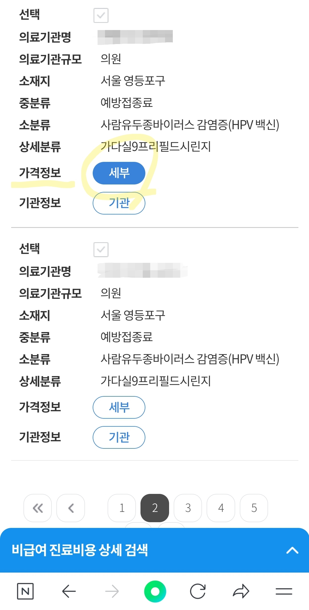 그러면 다양한 의료기관들이 목록에 나오고 그 중에 가격정보(세부)를 클릭하면 해당 의료기관의 가다실9 1회당 금액이 표시된다. 이 금액을 병원마다 비교해서 조금이라도 낮은 곳으로 방문하면 된다. 사이트에 제시되어 있는 금액은 꼭 정확하지 않을 수 있다. 참고사항으로 보고 해당 병원에 정확한 금액을 확인하기. 병원마다 3회 비용을 한번에 결제할 경우 조금 할인해주는 곳도 있다.