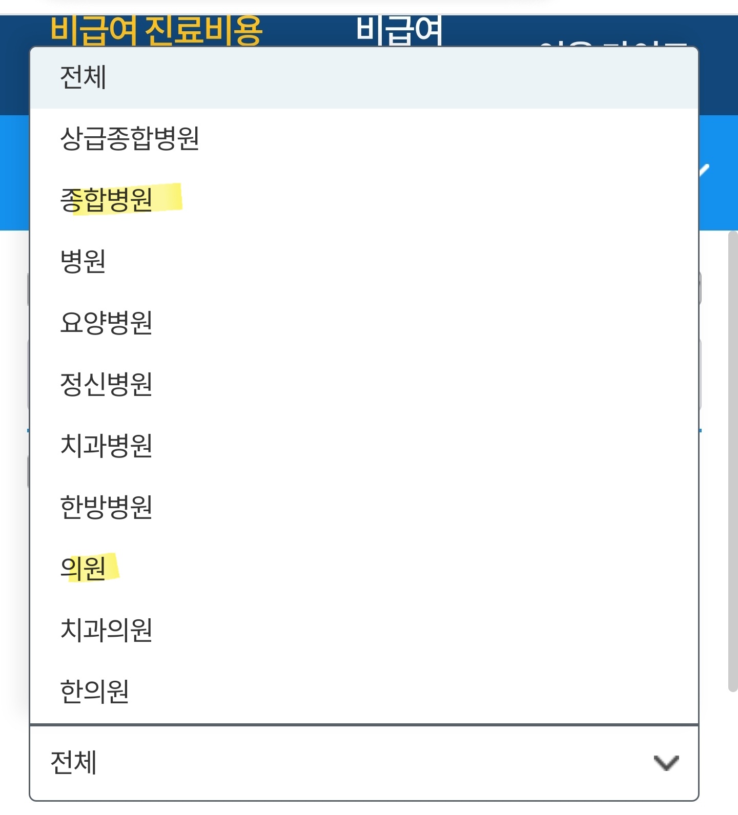 의료기관 규모는 종합병원 또는 의원을 선택합니다. 그외 다른거 선택하면 비급여 진료비 항목에 가다실9을 입력하면 항목이 안나옵니다.