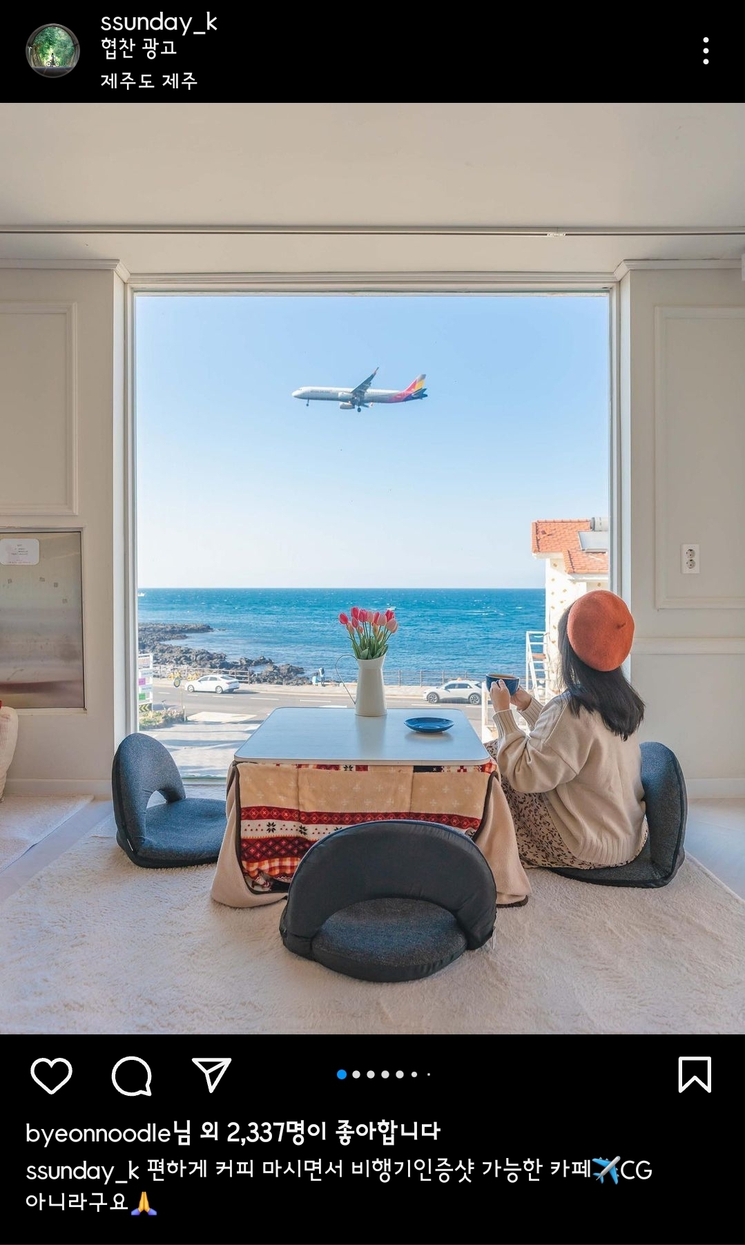 차로 이동하면 10분정, 버스 이용시 20~30분 정도 소요되고 시로코를 제주여행 일정에 넣었던 이유는 여행첫날 오후 비행기로 도착했고 저녁에 바로 지인들과 약속이 있었어요. 그래서 잠깐 다녀올 수 있으면서 뷰가 예쁜 카페를 찾고 있었는데 시로코카페는 제주공항으로 들어오는 비행기 샷이 예쁘기로 유명한 곳이라 꼭 가보고 싶었습니다.