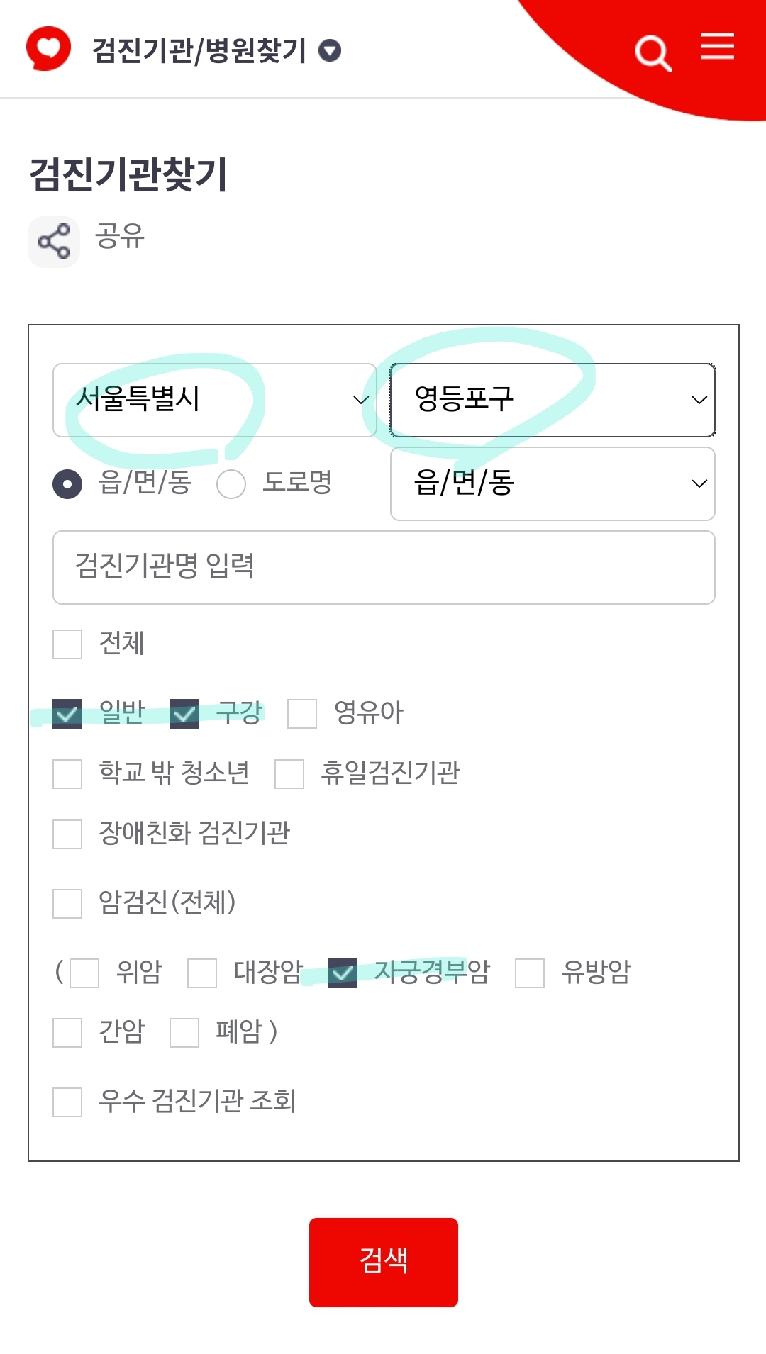 해당지역을 체크한다. 보통 직장인 건강검진은 일반, 구강이 해당되고 여자들은 자궁경부암 검사까지 받을 수 있다.