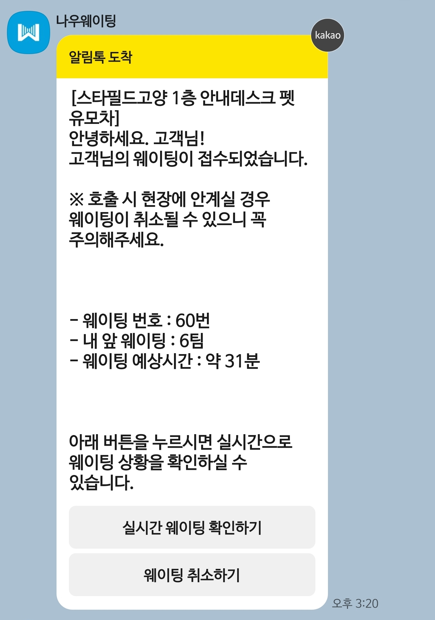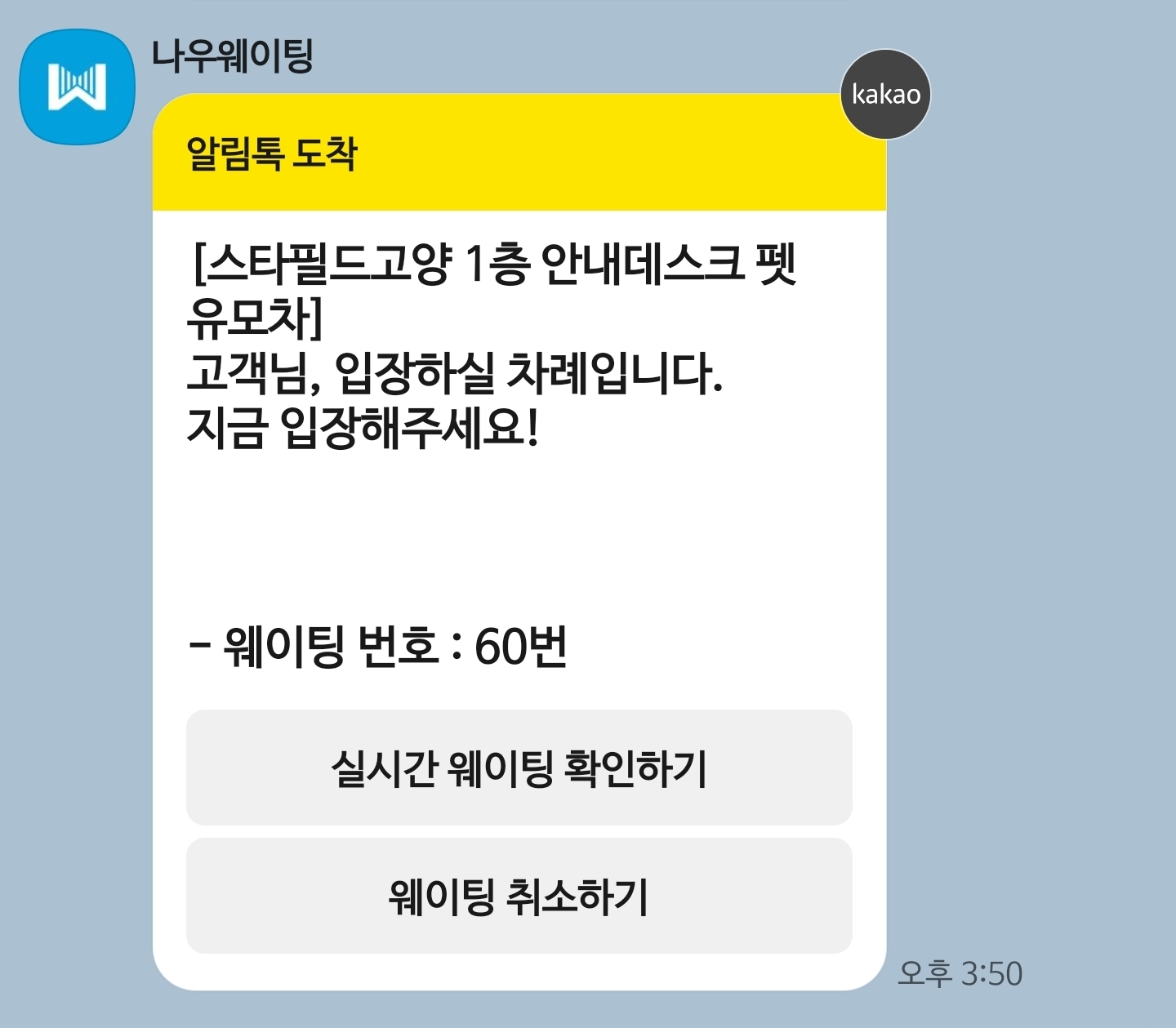 그러면 나우웨이팅 오픈톡으로 알림이 온다.