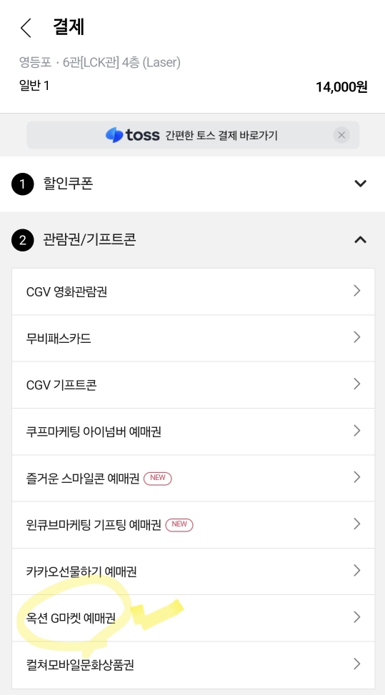 보고 싶은 영화 선택 및 자리선정까지 한 다음 결제방식에서 2번 관람권/기프티콘에 들어갑니다. 옥션 G마켓 예매권에 들어갑니다.