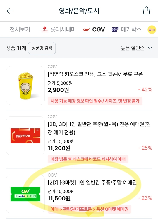 영화도 cgv뿐만 아니라 롯데시네마, 메가박스 티켓도 할인된 걸 구입할 수 있습니다. 티켓 구매할 때 주중, 주말, 온라인, 오프라인 구분되어 있으니 제목 잘 살펴보고 구매합니다. cgv 영화 티켓은 G마켓, 옥션 티켓들이 있었는데 저는 G마켓 주중/주말 티켓을 구매했습니다.